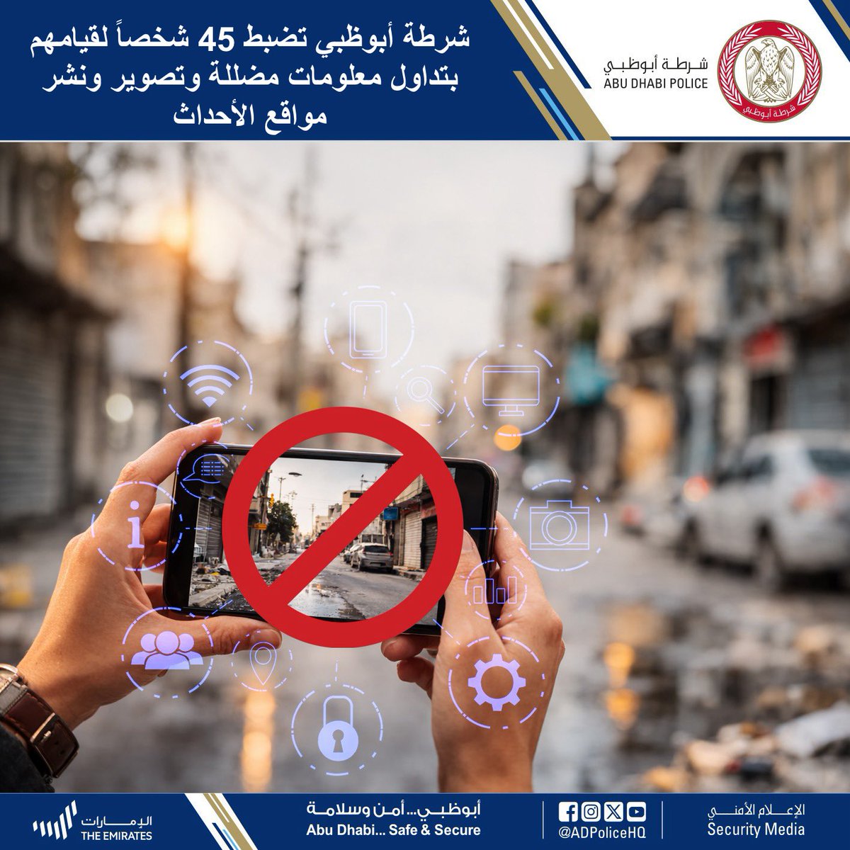 തെറ്റിദ്ധരിപ്പിക്കുന്ന ഉള്ളടക്കം പങ്കിടുന്നതും, നിലവിലെ സംഭവങ്ങൾ ചിത്രീകരിക്കുന്നതും നിയമനടപടികൾക്ക് കാരണമായേക്കാമെന്ന് അബുദാബി പോലീസ് മുന്നറിയിപ്പ് നൽകിയിട്ടുണ്ട്. ആക്രമണങ്ങൾ നടന്ന ഇടങ്ങളിൽ നിന്നുള്ള ദൃശ്യങ്ങൾ ചിത്രീകരിച്ചതിനും, അവ ഓൺലൈനിൽ പ്രസിദ്ധീകരിച്ചതിനും, ഇതിനൊപ്പം തെറ്റായതും, തെറ്റിദ്ധരിപ്പിക്കുന്നതുമായ വിവരങ്ങൾ പ്രചരിപ്പിച്ചതിനുമാണ് ഇവരെ അറസ്റ്റ് ചെയ്തിരിക്കുന്നത്.