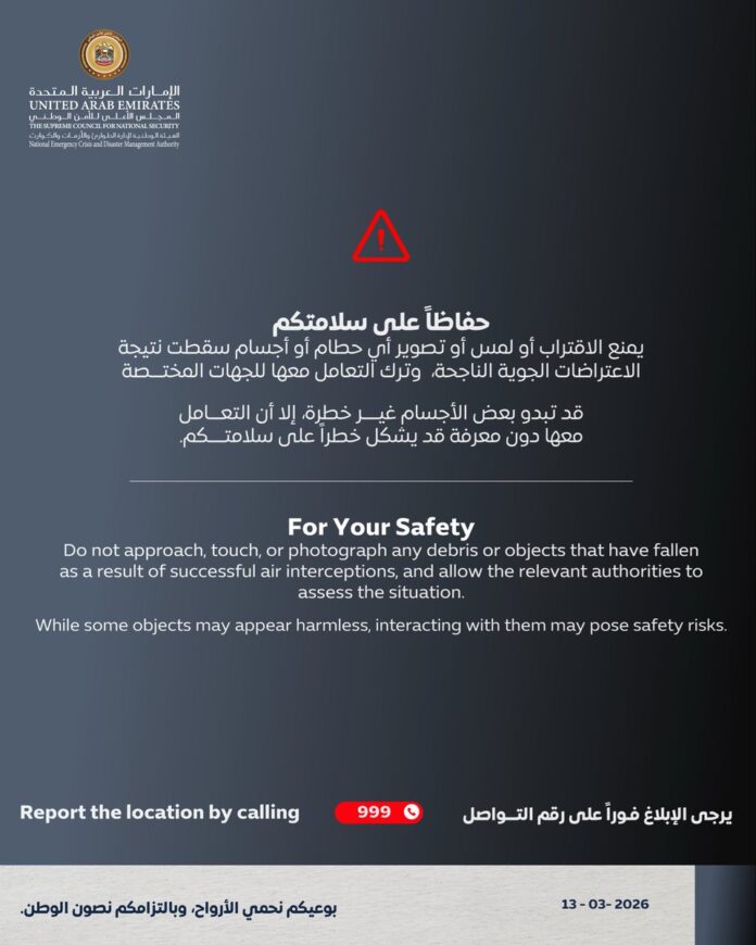 വ്യോമാക്രമണങ്ങളുടെ അവശിഷ്ടങ്ങളിൽ നിന്ന് സുരക്ഷിത അകലം പാലിക്കാൻ യു എ ഇ അധികൃതർ പൊതുജനങ്ങൾക്ക് നിർദ്ദേശം നൽകി. വ്യോമാക്രമണങ്ങൾ പ്രതിരോധിക്കുന്നതിന്റെ ഭാഗമായുണ്ടാകുന്ന അവശിഷ്ടങ്ങളിൽ നിന്ന് സുരക്ഷിതമായ അകലം പാലിക്കാനും, ഇത്തരം വസ്തുക്കൾ കണ്ടെത്തിയാൽ ഉടൻ തന്നെ അക്കാര്യം അധികൃതരുമായി റിപ്പോർട്ട് ചെയ്യാനും യു എ ഇ നാഷണൽ എമർജൻസി ക്രൈസിസ് ആൻഡ് ഡിസാസ്റ്റർ അതോറിറ്റി നിർദ്ദേശിച്ചിട്ടുണ്ട്.