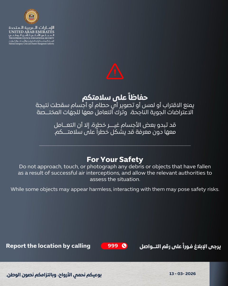 വ്യോമാക്രമണങ്ങളുടെ ഭാഗമായുണ്ടാകുന്ന അവശിഷ്ടങ്ങൾ, ഏതെങ്കിലും വസ്തുക്കൾ എന്നിവയെ സമീപിക്കുകയോ, സ്പർശിക്കുകയോ, ഫോട്ടോ എടുക്കുകയോ ചെയ്യരുതെന്ന് നാഷണൽ എമർജൻസി ക്രൈസിസ് ആൻഡ് ഡിസാസ്റ്റർ അതോറിറ്റി മുന്നറിയിപ്പ് നൽകിയിട്ടുണ്ട്. ഇത്തരം സംഭവങ്ങൾ കൈകാര്യം ചെയ്യേണ്ടത് പ്രത്യേക സംഘങ്ങളുടെ ഉത്തരവാദിത്വമാണെന്നും നാഷണൽ എമർജൻസി ക്രൈസിസ് ആൻഡ് ഡിസാസ്റ്റർ അതോറിറ്റി ഊന്നിപ്പറഞ്ഞു. ഇത്തരം വസ്തുക്കൾ നിരുപദ്രവകരമാണെന്ന് തോന്നുമെങ്കിലും അവയുമായി ഇടപഴകുന്നത് സുരക്ഷാ അപകടങ്ങൾക്ക് കാരണമാകുമെന്ന് അറിയിച്ച നാഷണൽ എമർജൻസി ക്രൈസിസ് ആൻഡ് ഡിസാസ്റ്റർ അതോറിറ്റി അവ സംബന്ധിച്ച വിവരങ്ങൾ പൊതുജനങ്ങൾ 999 എന്ന അടിയന്തര സേവന നമ്പറിൽ വിളിച്ച് റിപ്പോർട്ട് ചെയ്യണമെന്നും കൂട്ടിച്ചേർത്തു.