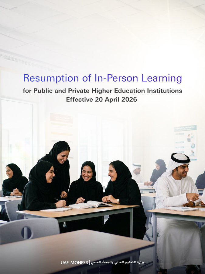 2026 ഏപ്രിൽ 20 തിങ്കളാഴ്ച മുതൽ യുഎഇയിലെ മുഴുവൻ പൊതു- സ്വകാര്യ ഉന്നത വിദ്യാഭ്യാസ സ്ഥാപനങ്ങളിലും നേരിട്ടുള്ള അദ്ധ്യയനം പുനരാരംഭിക്കും. രാജ്യത്തെ ഉന്നത വിദ്യാഭ്യാസ സ്ഥാപനങ്ങളിൽ സുരക്ഷാ മാനദണ്ഡങ്ങൾ ഉറപ്പാക്കുന്നതിനുള്ള തയ്യാറെടുപ്പുകൾ, പരിശീലനങ്ങൾ എന്നിവ പൂർത്തിയാക്കിയ സാഹചര്യത്തിലാണ് ഇത്തരം ഒരു തീരുമാനം. യു എ ഇ ഉന്നത വിദ്യാഭ്യാസ ശാസ്ത്ര ഗവേഷണ മന്ത്രാലയമാണ് ഇക്കാര്യം അറിയിച്ചത്. യുഎഇയിലെ നഴ്‌സറികൾ ഉൾപ്പടെയുള്ള മുഴുവൻ വിദ്യാലയങ്ങളിലും 2026 ഏപ്രിൽ 20, തിങ്കളാഴ്ച മുതൽ നേരിട്ടുള്ള അധ്യയനം പുനരാരംഭിക്കുമെന്ന് യു എ ഇ വിദ്യാഭ്യാസ മന്ത്രാലയം അറിയിച്ചിട്ടുണ്ട്. ഏതാനം സ്വകാര്യ ഉന്നത വിദ്യാഭ്യാസ സ്ഥാപനങ്ങളിൽ ആവശ്യമെങ്കിൽ ഹൈബ്രിഡ്, റിമോട്ട് ലേണിംഗ് മോഡലുകൾ നടപ്പിലാക്കാൻ അനുമതി നൽകിയിട്ടുണ്ടെന്നും മന്ത്രാലയം വ്യക്തമാക്കിയിട്ടുണ്ട്.