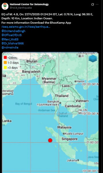 ന്യൂൽഹി: ഇന്ത്യൻ മഹാസമുദ്രത്തിൽ 6.4 തീവ്രത രേഖപ്പെടുത്തിയ ഭൂചലനം ഉണ്ടായി. വടക്കൻ സുമാത്രക്ക് സമീപത്ത് ഉണ്ടായ ഭൂചലനത്തിൽ ആൻഡമാൻ നിക്കോബാർ ദ്വീപുകളിലെ ഇന്ദിരപോയിന്റ്, ലിറ്റിൽ ആൻഡമാൻ എന്നീ സ്ഥലങ്ങളിൽ ജാഗ്രത നിർദേശം നൽകിയിട്ടുണ്ട്. അതേസമയം, കേരള തീരത്ത് നിലവിൽ സുനാമി മുന്നറിയിപ്പ് ഇല്ല എന്നും സമുദ്ര സ്ഥിതി പഠനക ഗവേഷണ കേന്ദ്രം പറഞ്ഞു. നാശനഷ്ടങ്ങളോ സുനാമി മുന്നറിയിപ്പുകളോ ഉണ്ടായതായി ഉടനടി റിപ്പോർട്ടുകൾ ഇല്ല. ഇന്ത്യൻ തീരപ്രദേശത്ത് നിന്ന് വളരെ അകലെയാണ് ഭൂചലനത്തിന്റെ കേന്ദ്രബിന്ദു എന്നും ഉദ്യോഗസ്ഥർ പറഞ്ഞു.