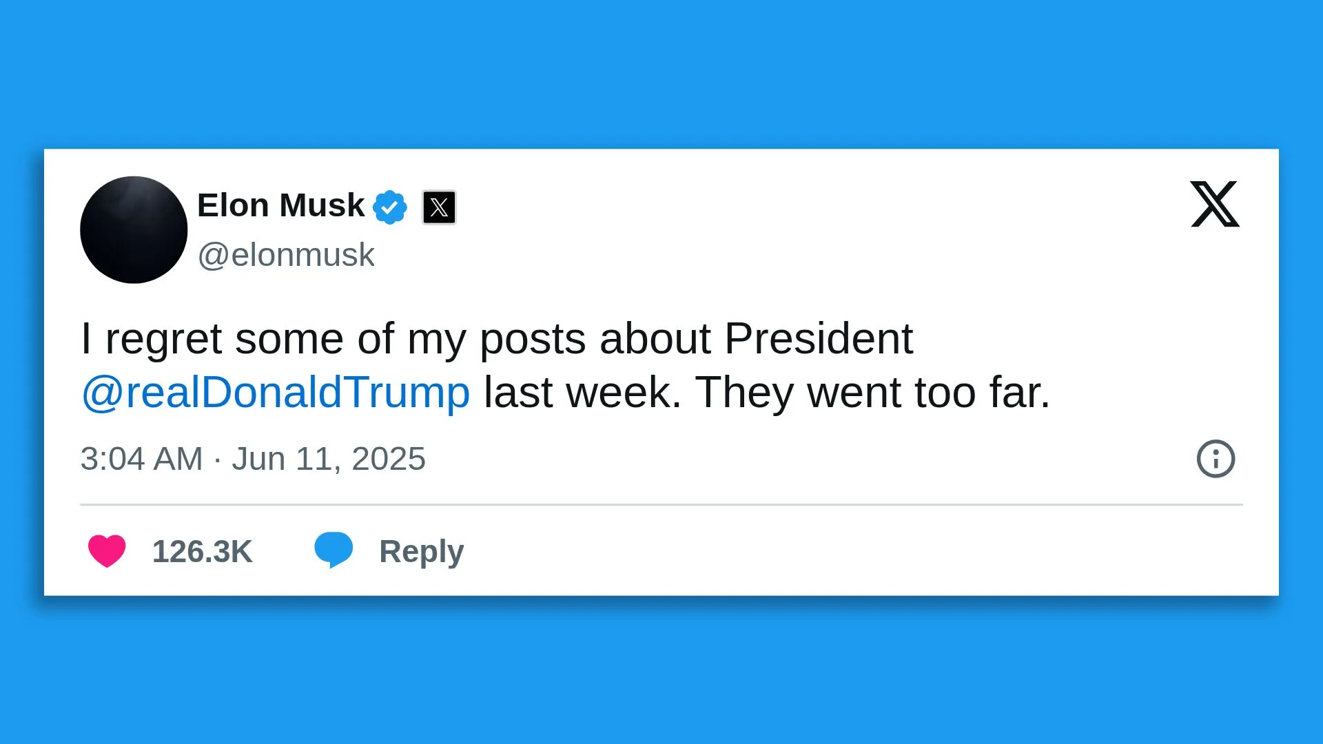 കഴിഞ്ഞ ആഴ്ച അമേരിക്കൻ പ്രസിഡന്റ് ഡൊണാൾഡ് ട്രംപിനെക്കുറിച്ചുള്ള തന്റെ ചില പോസ്റ്റുകളിൽ ഇലോൺ മസ്ക് തന്റെ സോഷ്യൽ മീഡിയ പ്ലാറ്റ്ഫോമായ എക്സിൽ ഖേദം പ്രകടിപ്പിച്ചു. “കഴിഞ്ഞ ആഴ്ച പ്രസിഡന്റ് ഡൊണാൾഡ് ട്രംപിനെക്കുറിച്ചുള്ള എന്റെ ചില പോസ്റ്റുകളിൽ ഞാൻ ഖേദിക്കുന്നു. അവ അതിരുകടന്നു,” ജൂൺ 11 ന് എലോൺ മസ്ക് എക്സിൽ പോസ്റ്റ് ചെയ്തു.