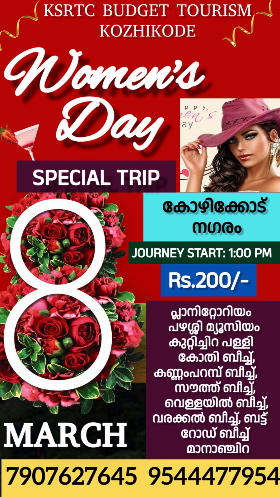 കോഴിക്കോട്: വനിതാ ദിനത്തിൽ വനിതകൾക്കായി സ്പെഷ്യൽ ട്രിപ്പൊരുക്കി കെ.എസ്.ആർ.ടി.സി. നാളെ 200 രൂപക്ക് കോഴിക്കോട് നഗരം ചുറ്റിക്കാണാനുള്ള ട്രിപ്പാണ് കെ.എസ്.ആർ.ടി.സി ഒരുക്കിയിരിക്കുന്നത്. കോഴിക്കോട് ബീച്ച്, മാനാഞ്ചിറ സ്ക്വയർ, പഴശ്ശി മ്യൂസിയം, കുറ്റിച്ചിറ പള്ളി, പ്ലാനിറ്റോറിയം, ഭട്ട് റോഡ് ബീച്ച്, കോതി ബീച്ച്, കണ്ണംപറമ്പ് ബീച്ച്, സൗത്ത് ബീച്ച്, വെള്ളയിൽ ബീച്ച്, വരയ്ക്കൽ ബീച്ച് തുടങ്ങിയ സ്ഥലങ്ങളാണ് ട്രിപ്പിലുൾപ്പെടുത്തിയിരിക്കുന്നത്. ഉച്ചയ്ക്ക് ഒരു മണിക്ക് ആണ് യാത്ര തുടങ്ങുക