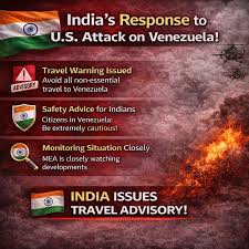 വെനിസ്വേലയിൽ യുഎസ് സൈനിക ആക്രമണങ്ങൾ നടത്തിയതിനു പിന്നാലെയും വെനിസ്വേലൻ പ്രസിഡന്റ് നിക്കോളാസ് മഡുറോയെയും ഭാര്യയെയും യുഎസ് സൈന്യം പിടികൂടിയെന്ന യുഎസ് പ്രസിഡന്റ് ഡൊണാൾഡ് ട്രംപിന്റെ അവകാശവാദത്തെത്തുടർന്നും വെനിസ്വേലയിലുള്ള തങ്ങളുടെ പൗരന്മാരോട് “അതീവ ജാഗ്രത” പാലിക്കാനും അവരുടെ നീക്കങ്ങൾ നിയന്ത്രിക്കാനും ഇന്ത്യ ശനിയാഴ്ച ഒരു ഉപദേശം നൽകി. വെനിസ്വേലയിലുള്ള എല്ലാ ഇന്ത്യക്കാരും കാരക്കാസിലെ ഇന്ത്യൻ എംബസിയുമായി ബന്ധപ്പെടണമെന്നും വിദേശകാര്യ മന്ത്രാലയം ഒരു പത്രക്കുറിപ്പിൽ അറിയിച്ചു. “ഏത് കാരണവശാലും വെനിസ്വേലയിലുള്ള എല്ലാ ഇന്ത്യക്കാരും അതീവ ജാഗ്രത പാലിക്കാനും അവരുടെ നീക്കങ്ങൾ നിയന്ത്രിക്കാനും കാരക്കാസിലെ ഇന്ത്യൻ എംബസിയുമായി സമ്പർക്കം പുലർത്താനും നിർദ്ദേശിക്കുന്നു,” പ്രസ്താവനയിൽ പറയുന്നു.