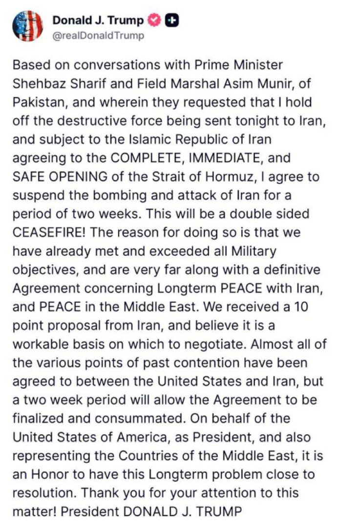 സൈനികപരമായ എല്ലാ ലക്ഷ്യങ്ങളും ഇതിനോടകം തന്നെ അമേരിക്ക കൈവരിച്ചതായും ഇറാനുമായുള്ള ചർച്ചകൾ അന്തിമ ഘട്ടത്തിലാണെന്നും ട്രംപ് അവകാശപ്പെട്ടു. “ദീർഘകാല സമാധാനത്തിനായുള്ള കൃത്യമായ കരാറിനോട് ഞങ്ങൾ വളരെ അടുത്തെത്തിയിരിക്കുന്നു. ഇറാനിൽ നിന്ന് 10 പോയിന്റുകളുള്ള ഒരു നിർദ്ദേശം ലഭിച്ചിട്ടുണ്ട്. അത് ചർച്ചകൾക്ക് അനുയോജ്യമായ ഒന്നാണ്,” ട്രംപ് പറഞ്ഞു. കഴിഞ്ഞ കാലത്തെ ഭൂരിഭാഗം തർക്കവിഷയങ്ങളിലും ഇരുരാജ്യങ്ങളും ഏകദേശ ധാരണയിൽ എത്തിയതായും ഈ രണ്ടാഴ്ചത്തെ ഇടവേള കരാർ അന്തിമമാക്കാൻ സഹായിക്കുമെന്നും അദ്ദേഹം കൂട്ടിച്ചേർത്തു.